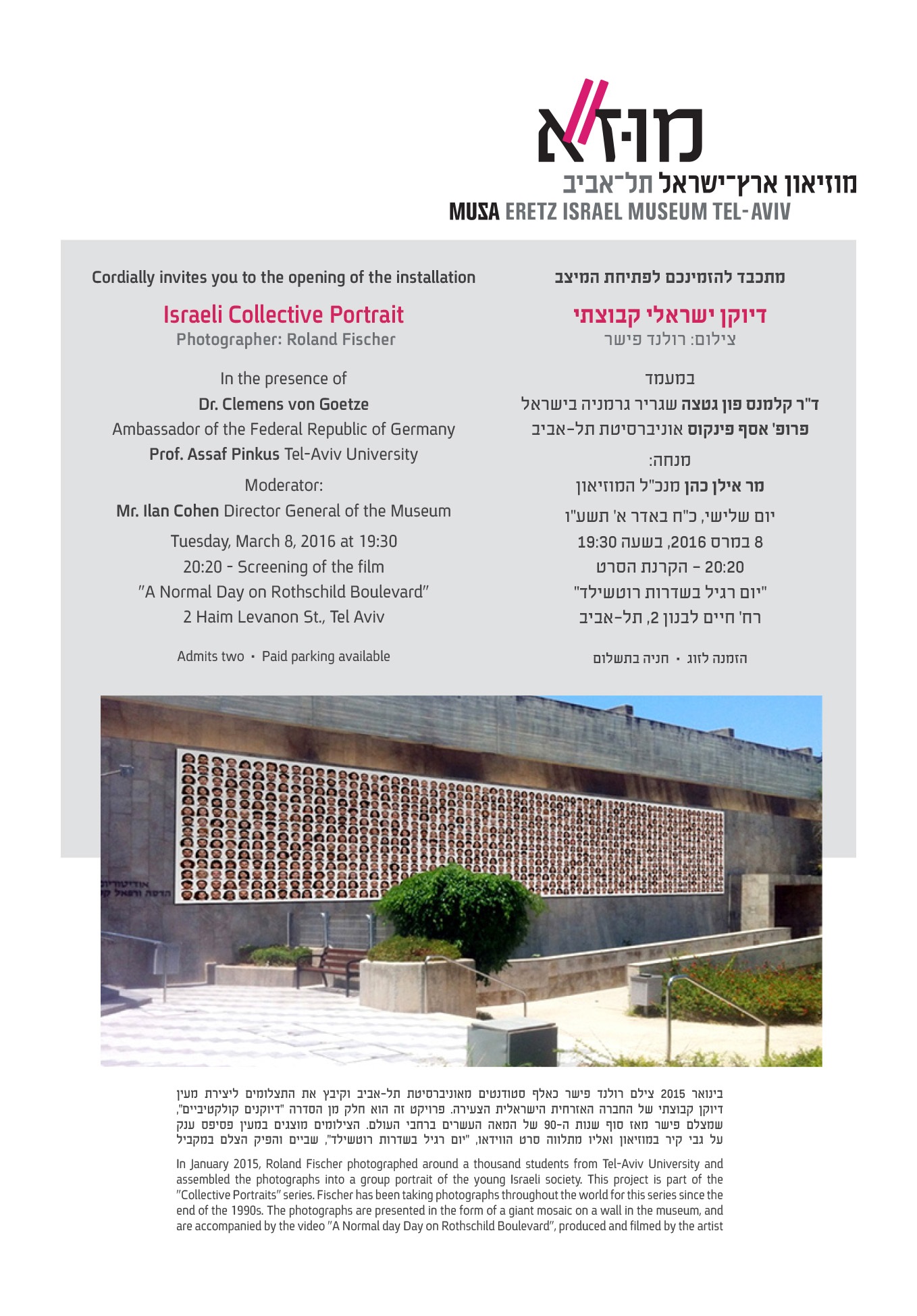 נשמח לראותכם בערב הפתיחה החגיגי שיתקיים ביום שלישי 8.3.16 בשעה 19:30 במוזיאון ארץ-ישראל, תל-אביב